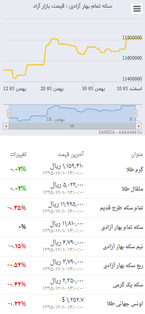 آنچه در ذیل می آید جدول قیمت روز جاری طلا و سکه و مقایسه با آخرین قیمت های ثبت شده روز گذشته است. جدول زیر به همراه نمودار تغییرات یک ماه، چند ماه و چند سال گذشته قیمتها میتواند نوسانات دقیق بازار را به شما نشان دهد؛