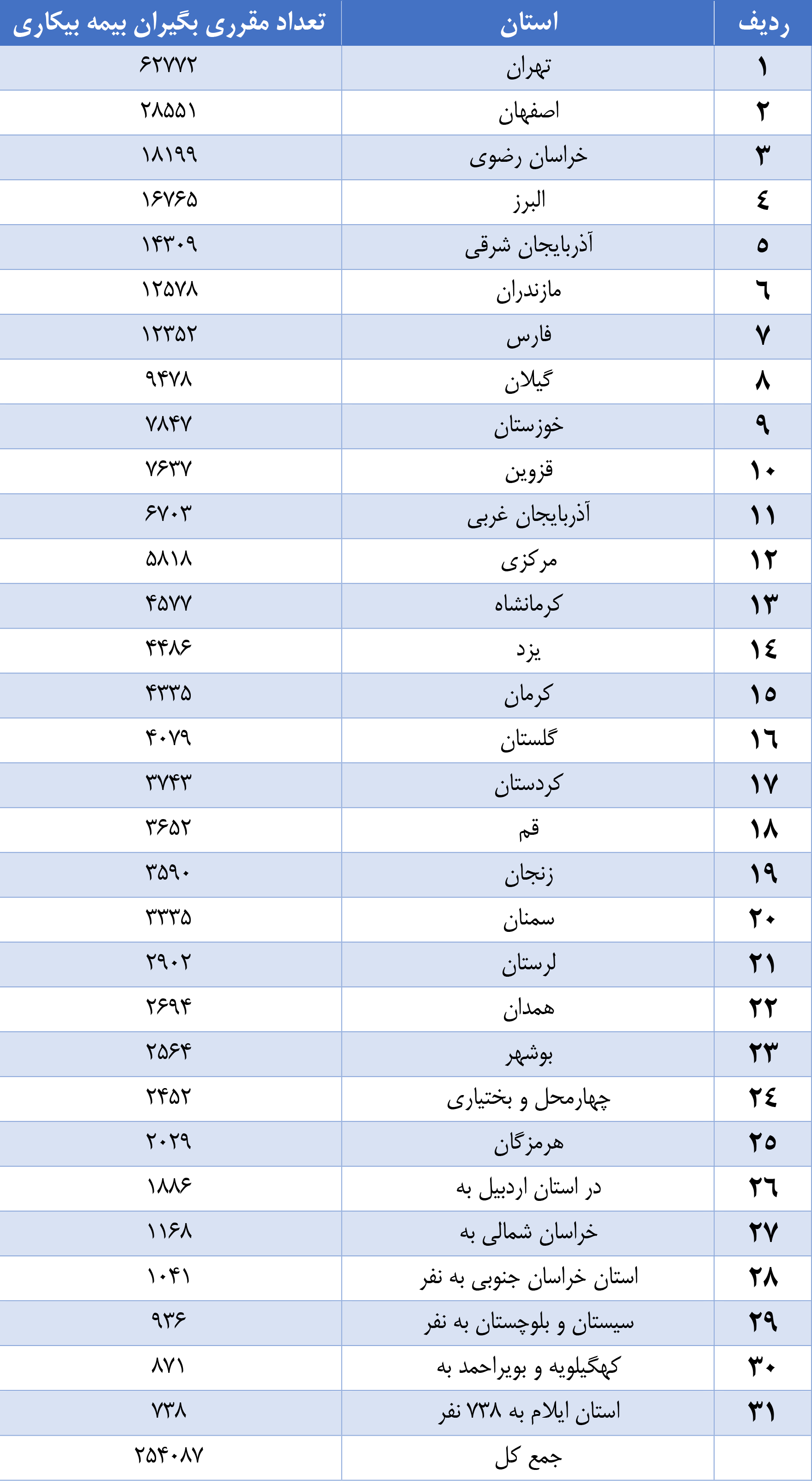 مجموع کل مقرری بگیران بیمه بیکاری در کشور ۲۵۴ هزار نفر است و استان تهران رکورددار بیشترین مقرری بگیر بیمه بیکاری است.