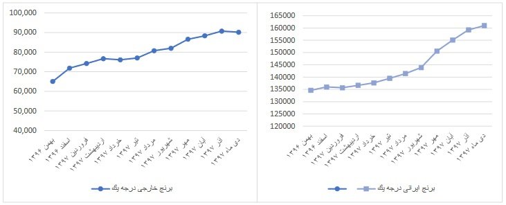 همچنین هر کیلوگرم برنج خارجی درجه یک در دی ماه امسال، ۹ هزار تومان بوده است؛ در حالیکه نرخ این محصول در دی ماه سال گذشته ۶ هزار و ۲۳۸ تومان بود؛ از این رو شاهد افزایش ۴۴.۵ درصدی قیمت برنج خارجی طی یک سال بوده ایم. البته نرخ این محصول در دی ماه نسبت به آذر ماه سال جاری، کاهش ۰.۶ درصدی داشته است.
