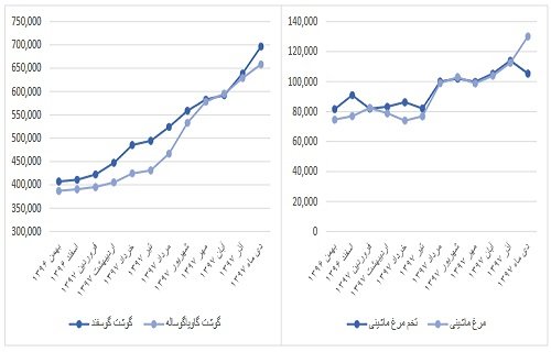 هر کیلوگرم گوشت گوسفندی نیز در دی ماه امسال، با نرخ ۶۹ هزار و ۶۷۱ تومان به فروش رسیده است که نسبت به ۴۰ هزار و ۶۰۰ تومان در دی ماه سال ۹۷، رشد ۷۱.۶ درصدی را تجربه کرده است. نرخ این محصول نسبت به آذرماه سال جاری که ۶۳ هزار و ۸۶۸ تومان بود، افزایش ۹.۱ درصدی داشته است.