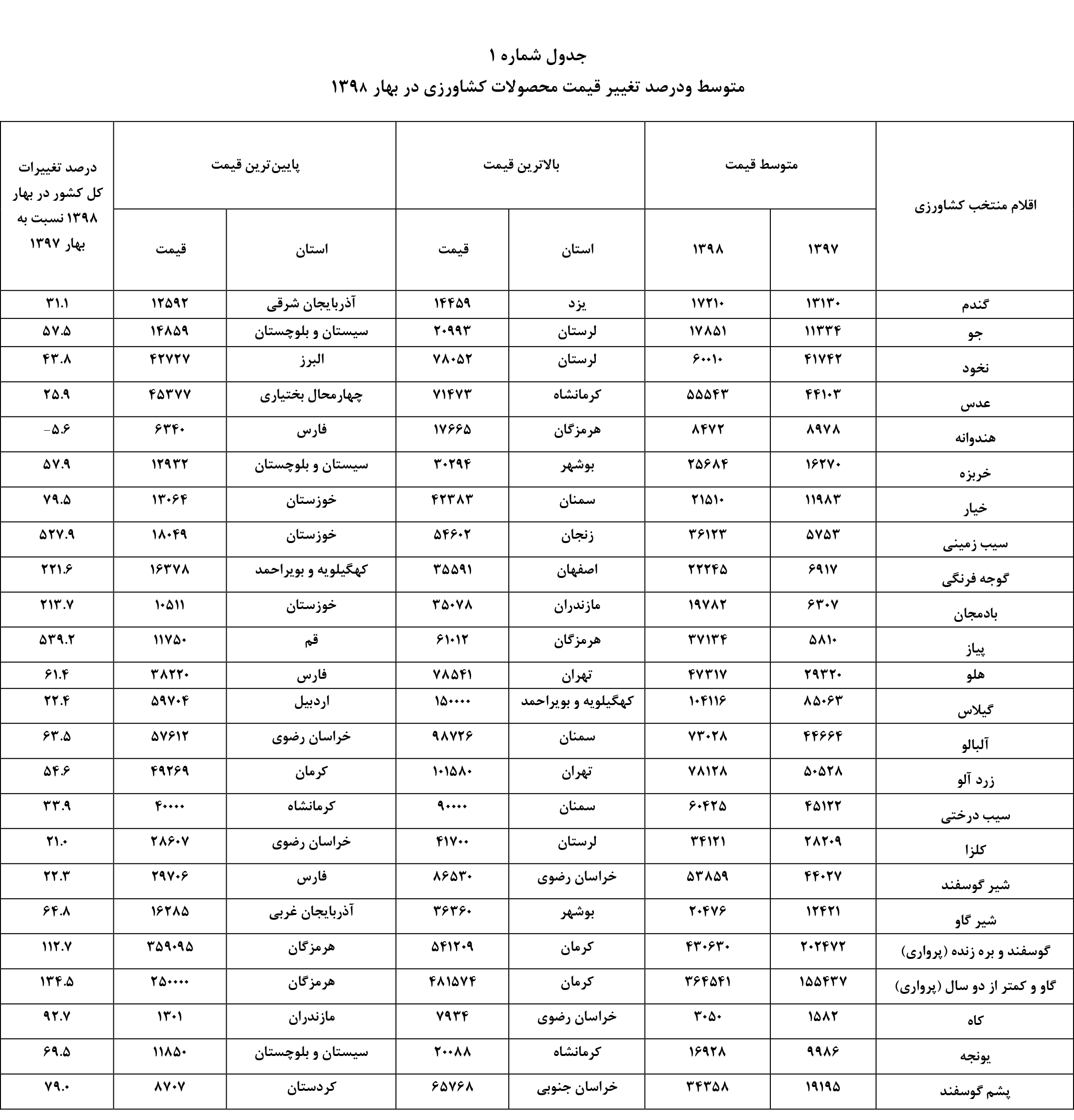 به گزارش پایگاه خبری آرمان اقتصادی به نقل از مرکز آمار ایران، متوسط قیمت محصولات و هزینه خدمات کشاورزی بهار ۱۳۹۸ منتشر شد که بر اساس این گزارش، در بخش غلات، در سه ماهه اول سال ۱۳۹۸، متوسط قیمت گندم ۱۷۲۱۰ ریال و متوسط قیمت جو ۱۷۸۵۱ ریال بوده که به ترتیب نسبت به فصل مشابه سال قبل ۳۱.۱ درصد و ۵۷.۵ درصد افزایش داشتهاند.