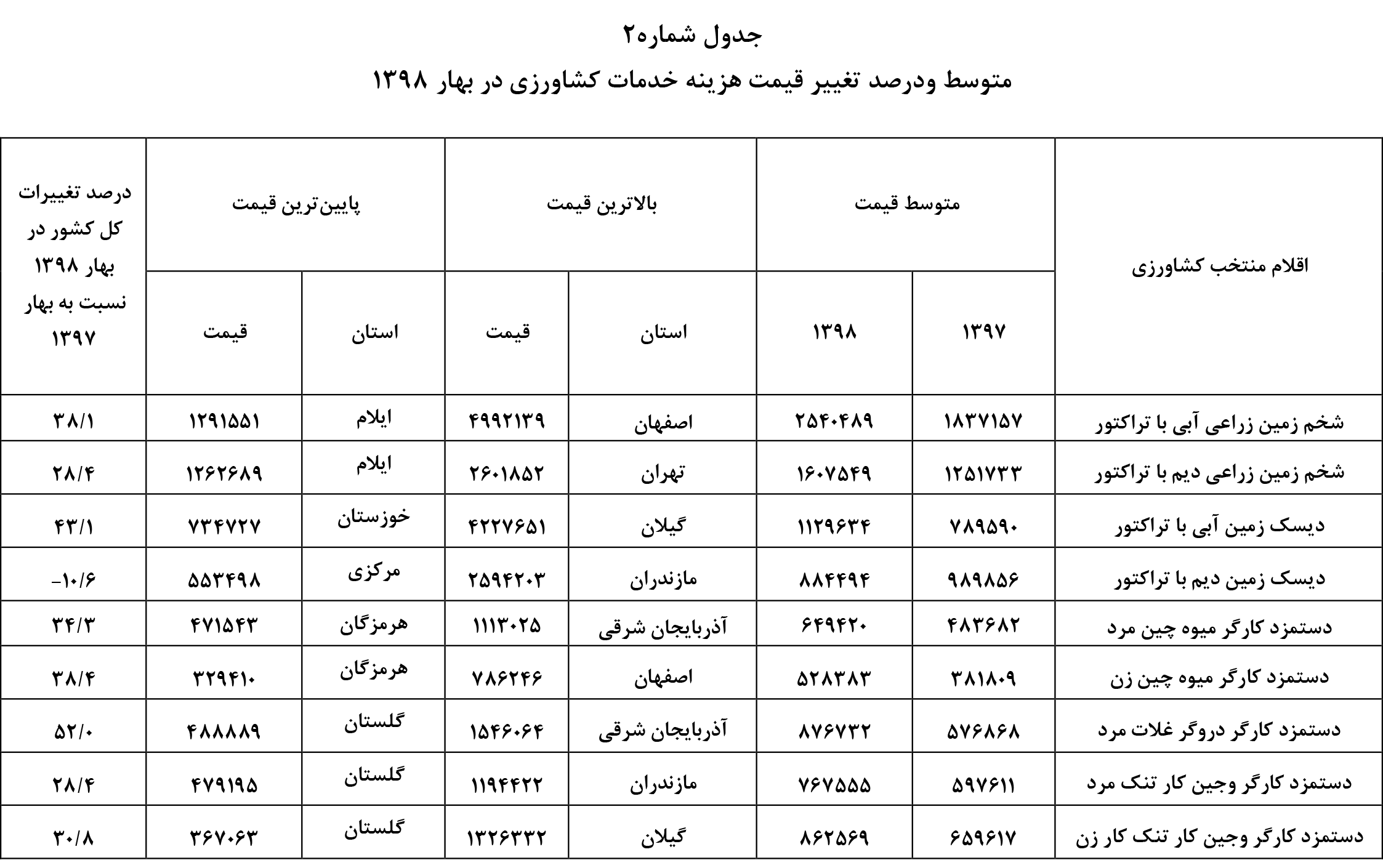 در بخش هزینه های خدمات ماشینی، در سه ماهه اول سال ۱۳۹۸، هزینه شخم یک هکتار زمین زراعی آبی ۲۵۴۰۴۸۹ ریال و هزینه شخم یک هکتار زمین زراعی دیم ۱۶۰۷۵۴۹ ریال بوده که به ترتیب نسبت به فصل مشابه سال قبل ۳۸.۱ و ۲۸.۴ درصد افزایش داشتهاند.