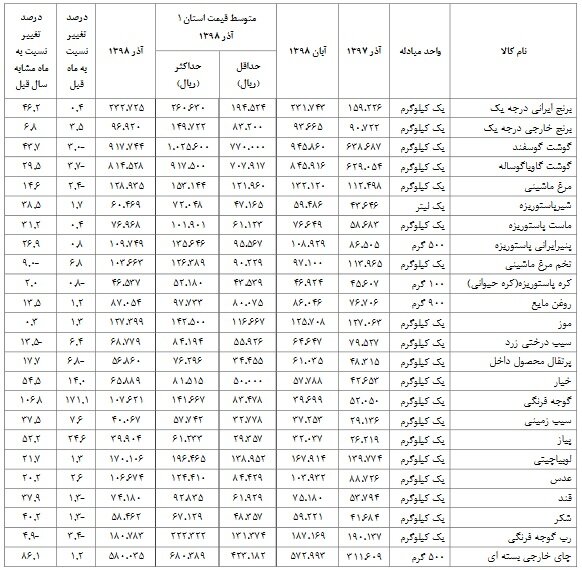 نرخ این کالاها نسبت به آذرماه سال گذشته، با رشد مواجه بوده است که بر این اساس، برنج ایرانی درجه یک ۴۶.۲ درصد، برنج خارجی درجه یک ۶.۸ درصد، شیر پاستوریزه ۳۸.۵ درصد، ماست پاستوریزه ۳۱.۲ درصد، پنیر ایرانی پاستوریزه ۲۶.۹ درصد، روغن مایع ۱۳.۵ درصد، موز ۰.۳ درصد، خیار ۵۴.۵ درصد، گوجه فرنگی ۱۰۶.۸ درصد، سیب زمینی ۳۷.۵ درصد، پیاز ۵۲.۲ درصد، لوبیا چیتی ۲۱.۷ درصد، عدس ۲۰.۲ درصد و چای خارجی بسته ای ۸۶.۱ درصد گران شده اند.