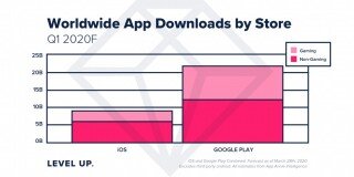 نمودار زیر به وضوح نشان می دهد که تعداد دفعات دانلود اپلیکیشن های اندرویدی در پلتفرم فروشگاه گوگل پلی استور در سه ماهه نخست سال جاری میلادی نسبت به رقیب خود فروشگاه اپ استور اپل رشد و افزایش بسیار بیشتری را به خصوص در اپلیکیشن های غیر بازی و گیمینگ تجربه کرده است.
