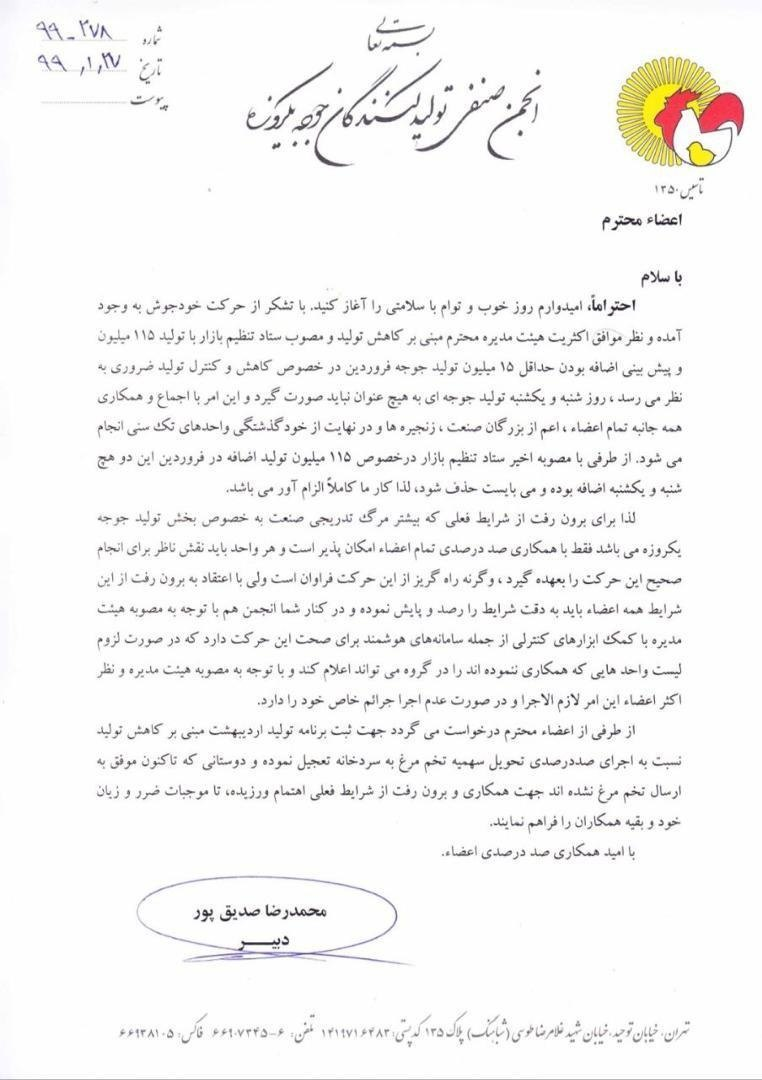 تصویر مصوبه انجمن جوجه یک روزه خطاب به تولیدکنندگان مبنی بر لزوم معدوم سازی ۱۵ میلیون قطعه جوجه جهت تعادل بخشی به بازار