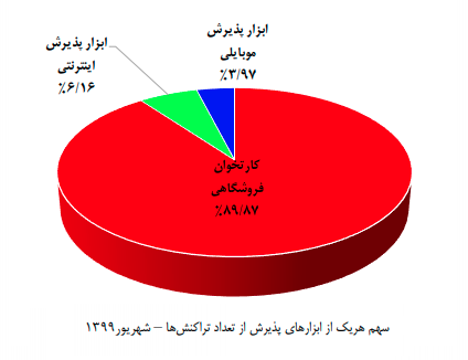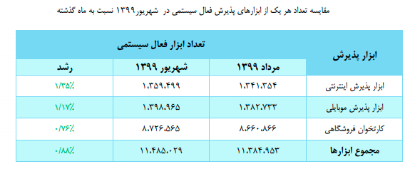 تعداد ابزارهای شاپرکی در مجموع نسبت به مرداد ماه رشد ۸۸. ۰ درصدی را تجربه کردهاند که به نظر میرسد سبب این تغییر، افزایش ۷۶. ۰ درصدی تعداد ابزار کارتخوان فروشگاهی است. ابزارهای پذیرش اینترنتی در شهریور ۱۳۹۹ نسبت به مرداد ماه رشد ۳۵. ۱ درصدی را تجربه کرده اند و تعداد ابزار پذیرش موبایلی نیز در مدت مشابه با افزایش ۱۷. ۱ درصدی همراه بوده است.