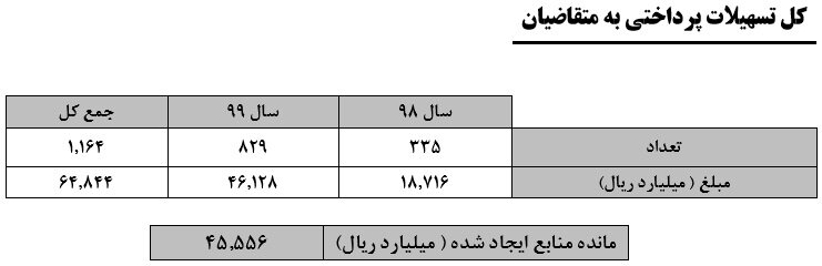 بر این اساس، بررسی آخرین وضعیت پرداخت تسهیلات در قالب تبصره ۱۸ از ابتدای سال تا پایان آبان ماه بیانگر آن است که در مدت زمان مورد بررسی ۴۶ هزار و ۱۲۸ میلیارد ریال (۴ هزار و ۶۱ میلیارد تومان) به ۸۲۹ واحد متقاضی دریافت تسهیلات، وام پرداخت شده است.