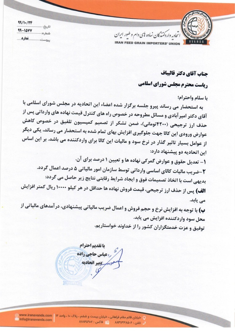به استحضار میرساند؛ پیرو جلسه برگزار شده اعضا این اتحادیه در مجلس شورای اسلامی با آقای دکتر امیرآبادی و مسائل مطروحه در خصوص راههای کنترل قیمت نهادههای وارداتی پس از حذف ارز ترجیحی (۴۲۰۰ تومانی)، ضمن تشکر از تصمیم کمیسیون تلفیق در خصوص کاهش عوارض ورودی این کالا جهت جلوگیری افزایش بهای تمام شده به استحضار میرساند، یکی دیگر از عوامل بسیار تأثیر گذار در نرخ سود و مالیات این کالا برای واردکننده میباشد. بر این اساس این اتحادیه دو پیشنهاد دارد: