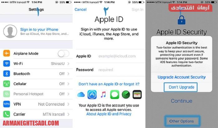 نکته: اگر صفحه Apple ID Security را مشاهده کردید، به هیچ عنوان روی Continue کلیک نکنید، دلیل این موضوع درخواست اپل از شما برای تأیید هویت دو مرحله ای با یک شماره تلفن خارجی است، متأسفانه به دلیل اینکه کشور ایران جزو لیست تحریم های کمپانی اپل قرار دارد فعال کردن این قابلیت فعلا برای ما مقدور نیست بنابراین با انتخاب گزینه Other Options و سپس کلیک بر روی Don’t Upgrade از این قسمت صرف نظر کنید.