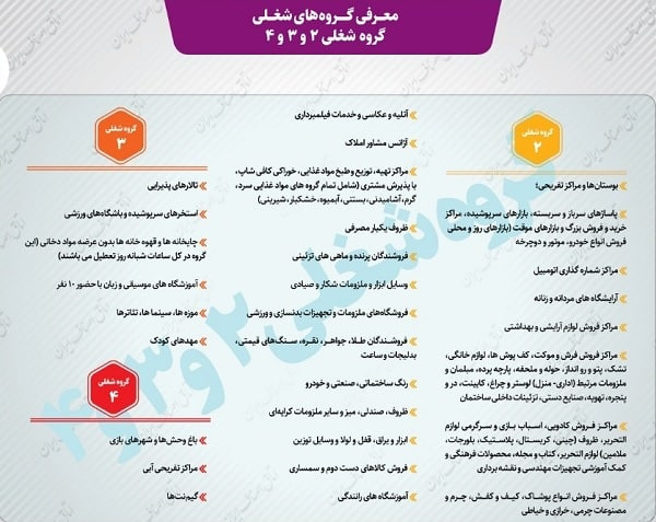 مجتبایی افزود: در شرایط قرمز، کلیه صنوف گروه شغلی ۲، ۳ و ۴ تعطیل و در شرایط نارنجی کلیه صنوف گروه شغلی ۳ و ۴ باید تعطیل باشند.