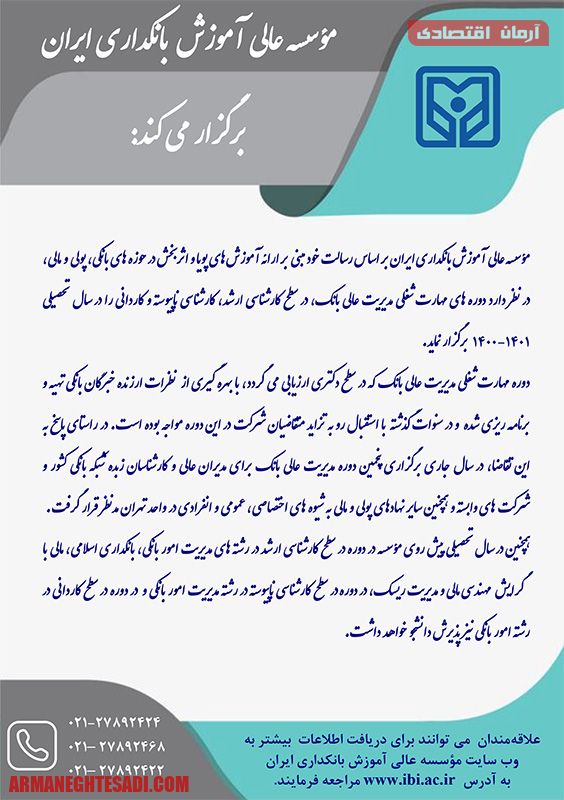 گفتنی است علاقمندان می توانند برای کسب اطلاعات بیشتر به وب سایت موسسه عالی آموزش بانکداری ایران به نشانی https://www.ibi.ac.ir مراجعه کنند.