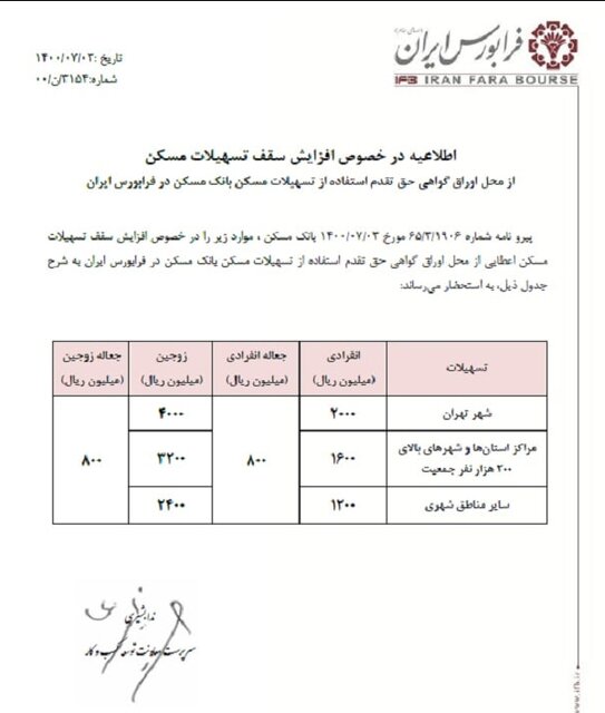 اکنون، بانک عامل بخش مسکن سقفهای جدید تسهیلات خرید مسکن شامل افزایش وام مسکن برای متقاضیان فردی و زوجین تهرانی، شهرهای بالای ۲۰۰ هزار نفر و سایر شهرها به ترتیب «۲۰۰ و ۴۰۰»، «۱۶۰ و ۳۲۰» و «۱۲۰ و ۲۴۰» میلیون تومانی و همچنین افزایش سقف جعاله تعمیرات مسکن تا ۸۰ میلیون تومان را به فرابورس ایران ابلاغ کرد.