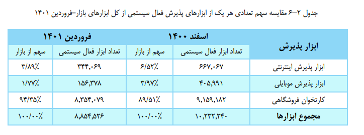 همچنین مقایسه سهم تعداد هر یک از این ابزارهای پذیرش فعال سیستمی از کل ابزارهای بازار در فروردین ماه ۱۴۰۱، نشان می دهد سهم کارتخوان های فروشگاهی از بازار ۹۴.۳۵ درصد بوده است که این میزان در اسفندماه سال قبل، ۸۹.۵۱ درصد تعیین شده بود و سهم ابزار پذیرش موبایلی از بازار در اولین ماه بهار ۱۴۰۱، به ۱.۷۷ درصد رسیده که نسبت به اسفندماه، کاهش یافته است.