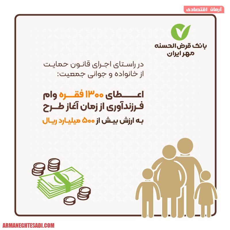بانک قرضالحسنه مهر ایران در راستای اجرای سیاستهای کلی جمعیت ابلاغی مقام معظم رهبری (مدظله العالی) و ماده (۱۰) “قانون حمایت از خانواده و جوانی جمعیت” تاکنون تعداد ۱۳۰۰ فقره وام قرضالحسنه فرزندآوری به مبلغ ۵۰۰ میلیارد ریال پرداخت کرده است.