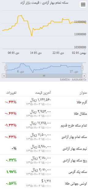 آنچه در ذیل می آید جدول قیمت روز جاری طلا و سکه و مقایسه با آخرین قیمت های ثبت شده روز گذشته است. جدول زیر به همراه نمودار تغییرات یک ماه، چند ماه و چند سال گذشته قیمتها میتواند نوسانات دقیق بازار را به شما نشان دهد؛