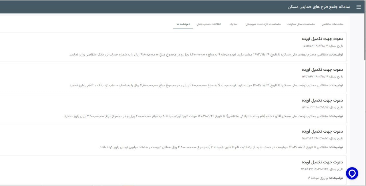 «متقاضی محترم نهضت ملی مسکن، آقای / خانم …، تا تاریخ ۱۴۰۳/۱۰/۲۴ ساعت ۰۰:۰۰ مهلت دارید آورده مرحله ۹ به مبلغ ۱,۶۰۰,۰۰۰,۰۰۰ ریال و در مجموع مبلغ ۴,۸۰۰,۰۰۰,۰۰۰ ریال را به شماره حساب… نزد بانک ملی واریز نمایید.»