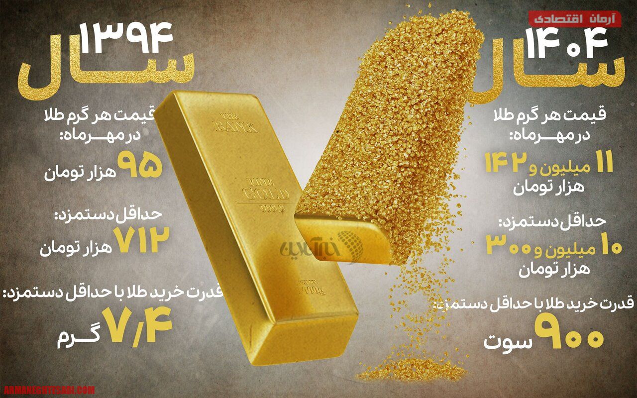 بررسیها نشان میدهد حداقل دستمزد کارگر ایرانی در سال ۱۳۹۴ برابر با ۷۱۲ هزار تومان بوده است. این دستمزد با نرخ ۷.۴گرم طلا در این سال برابری میکرد . حداقل دستمزد در سال جاری ۱۰ میلیون و سیصد هزار تومان است. این نرخ با اغماض کفاف خرید ۹۰۰ سوت طلا را میدهد. اینفوگرافی زیر نشان میدهد قدرت خرید دستمزد کارگرد ایرانی در قیاس با طلا چقدر است.