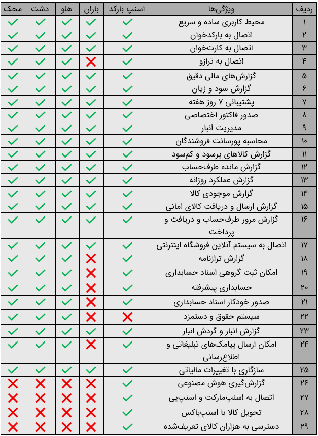 تا به اینجا اطلاعات مربوط به بهترین نرم‌افزار‌های حسابداری سوپرمارکت‌ها را ارائه کردیم، اما برای رسیدن به انتخاب لازم است که تمام این نرم افزارها و امکانات آنها در قالب یک جدول مقایسه کنید.