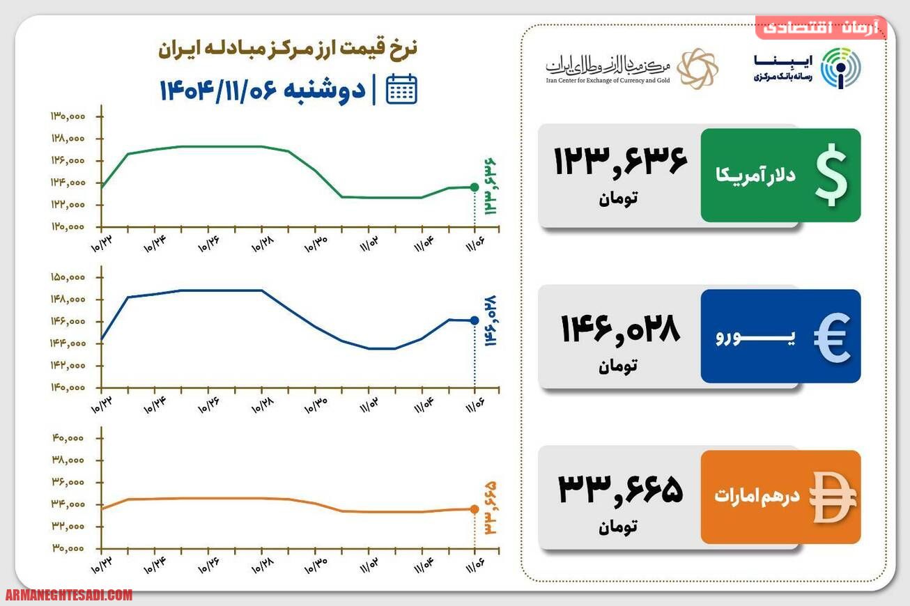 به گزارش خبرنگار ایبنا، امروز دوشنبه ۶ بهمن ماه ۱۴۰۴، قیمت فروش حواله دلار آمریکا در مرکز مبادله ارز و طلای ایران ۱۲۳ هزار ۶۳۶ تومان و قیمت خرید حواله دلار ۱۲۲ هزار و ۵۲۳ تومان است.