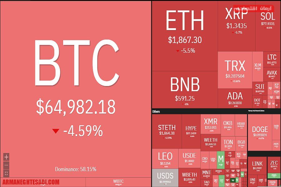 بر اساس آخرین داده های بازار، بیت کوین (BTC) با کاهش ۴.۰۵ درصدی به قیمت ۶۴,۹۳۹ دلار سقوط کرد. اتریوم (ETH) نیز با افت ۴.۸۰ درصدی به محدوده ۱,۸۶۳ دلار رسید و سولانا (SOL) با ثبت بیشترین کاهش در میان ارزهای اصلی، ۶.۱۹ درصد از ارزش خود را از دست داد و به ۷۷.۷۵ دلار رسید.