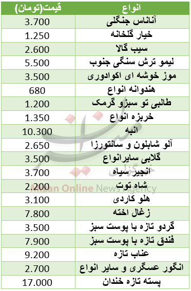 به گزارش خبرنگار آرمان اقتصادی، نرخ انواع میوه و در میادین میوه و تره بار به شرح زیر است: انتهای پیام/ منبع:میزبان