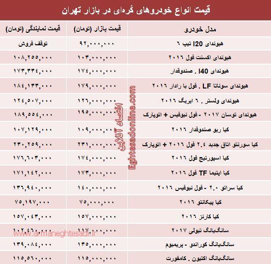 آرمان اقتصادی – محمد نقدی: آنچه در زیر میآید قیمت روز انواع خودروهای کُرهای در سطح بازار پایتخت است که ممکن است تا ۵ درصد در مناطق مختلف تهران دارای نوسان باشد؛ منبع:اقتصادآنلاین