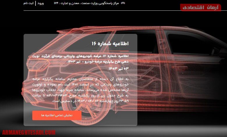طبق اعلام سامانه یکپارچه عرضه خودروهای وارداتی امروز آخرین مهلت انتخاب خودروهای وارداتی برای کسانی است که در اسفندماه ۱۴۰۱ ثبت نام کرده بودند. به گزارش آرمان اقتصادی، سامانه یکپارچه عرضه خودروهای وارداتی از روز دوشنبه ۲۴ اردیبهشت ماه برای ثبت نام کنندگان اسفند ماه سال ۱۴۰۱ با عرضه ۱۴…
